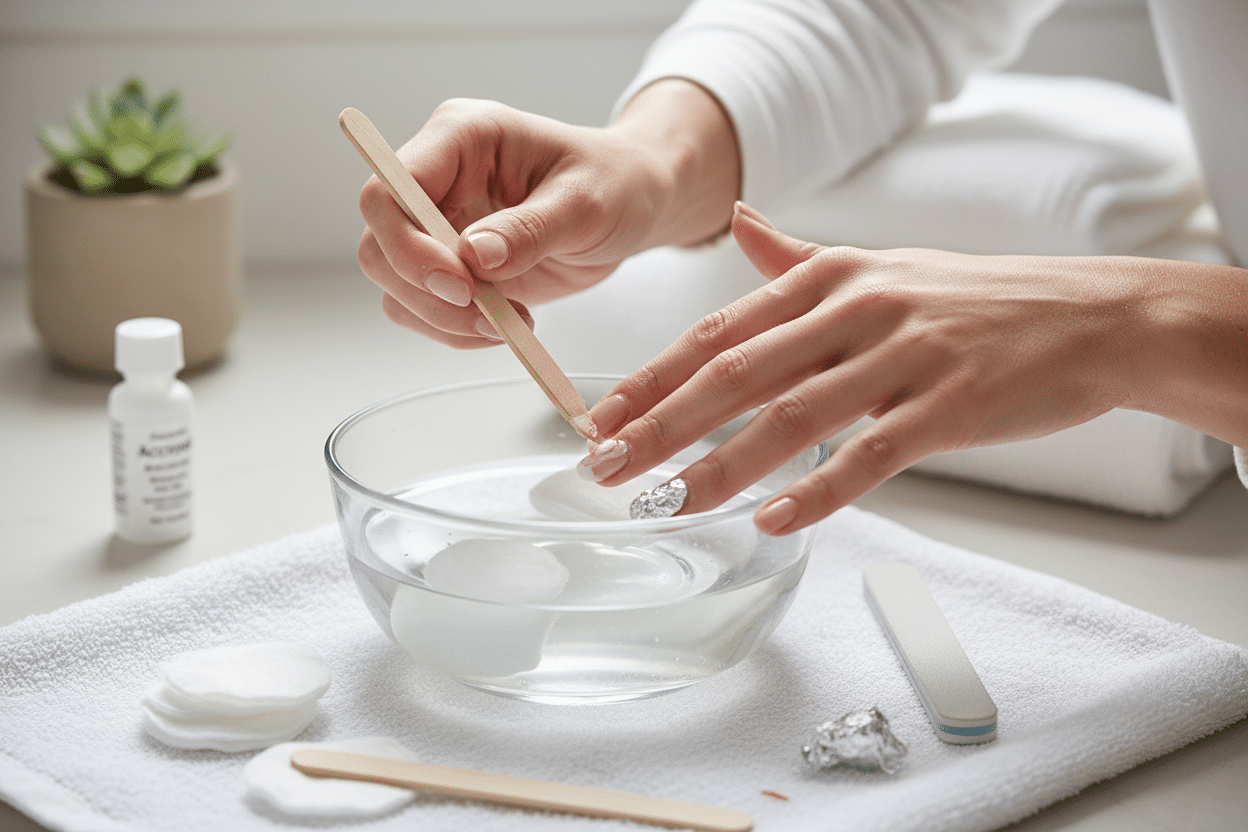 Good preparation makes the difference between a clean removal and damaged nails. Gathering everything before starting means the process flows without interruption, which matters because some steps are time-sensitive.